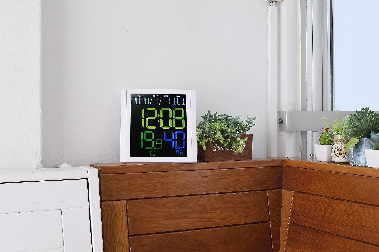 大型カラーディスプレイの時計 温湿度計です。スタンドもついていますので卓上に置いても使用できます。大きな数字で、機能をシンプルにまとめました。[日にち / 時刻 / 温・湿度計]